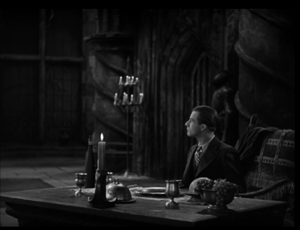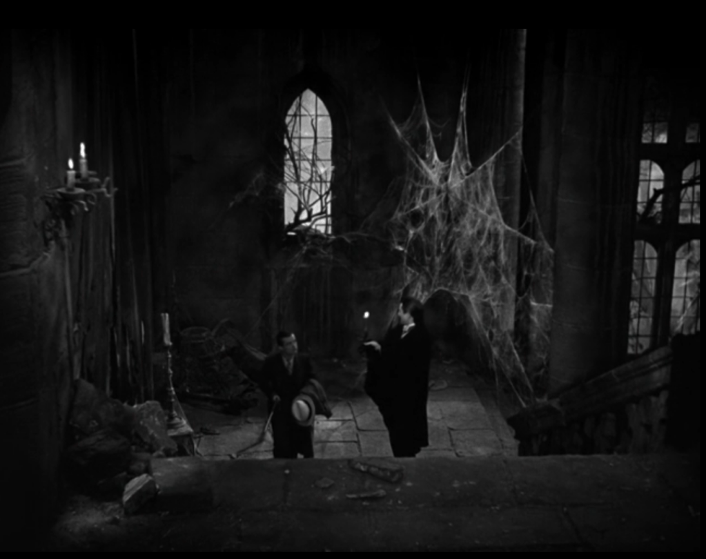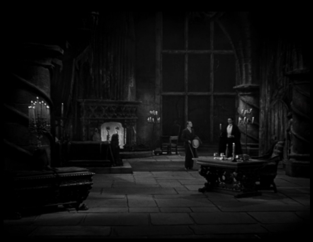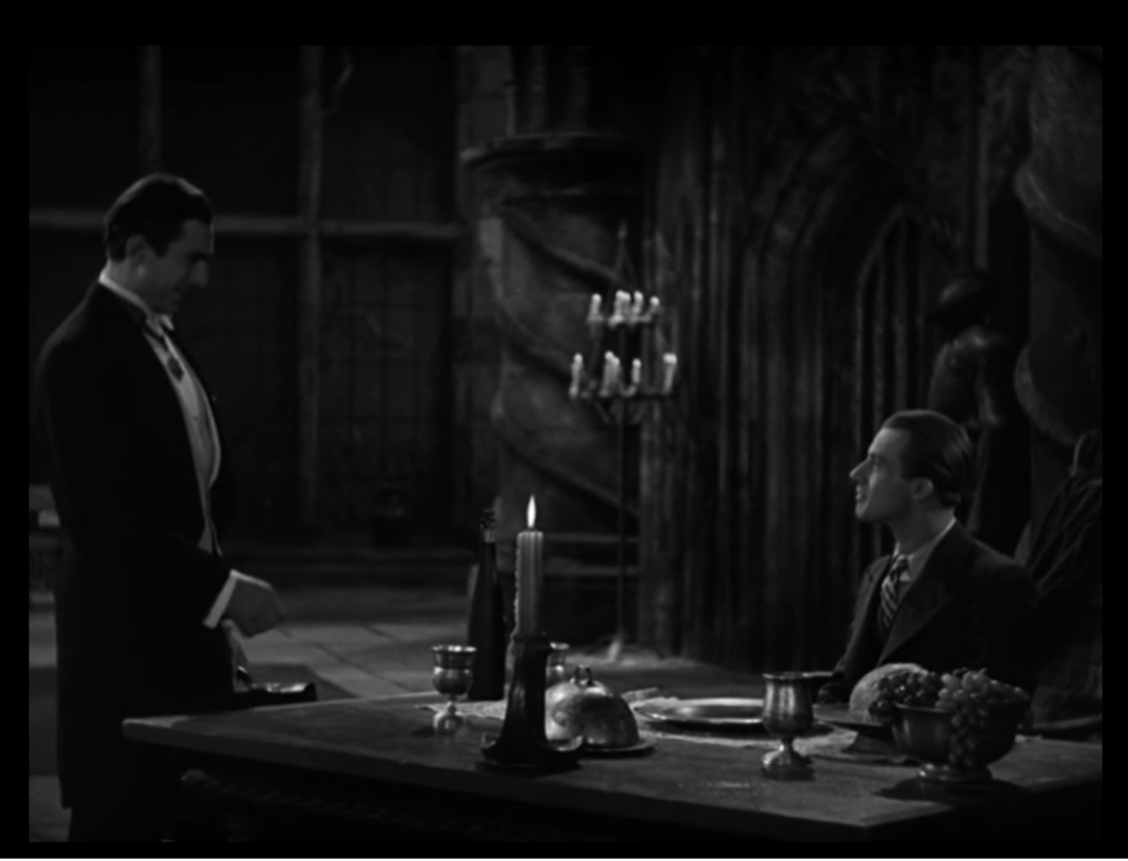 Additionally, the paradoxical vastness and claustrophobia of the room in his castle, which appears to be shot at a wider angle, shows that though Dracula has much of the control over the situation, what he does have is beginning to slip. In addition, the objects within the main dining/bedroom of the castle are mostly positioned off-center adding to that further sense of disconnect in what is an effective manner of making an audience feel disoriented. Dracula has the power of hypnosis and does hypnotize Renfield so this camera work is likely to make that apparent to an audience who might have not read the novel. Of course, this idea and subtext are more present in the 1897 novel by Bram Stoker but it is an interesting one nonetheless. The shadow play is a little overplayed but it’s really well done and I love how it makes Bela Lugosi look menacing and emphasizes his facial expressions. The objects within the castle (including Dracula) always seem to be bigger and towering over Renfield specifically.